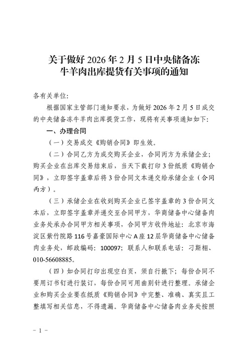 關(guān)于做好2026年2月5日中央儲(chǔ)備凍牛羊肉出庫(kù)提貨有關(guān)事項(xiàng)的通知